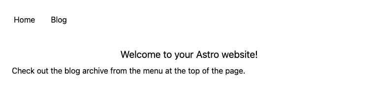 - 1 2 3 4 5 6 7- --- import BaseLayout from '../layouts/BaseLayout.astro'; --- <BaseLayout title="Welcome to your Astro website!"> <p>Check out the blog archive from the menu at the top of the page.</p> </BaseLayout>